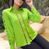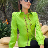 BLUSA CAMISERA, MANGA LARGA, CUELLO SPORT, CALADO AL FRENTE Y MANGAS