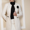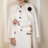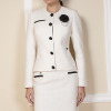 FALDA CON PRETINA RECTA EN TELA COMBINACION. DELANTERO RECTO CON PINZA LATERAL, VIVO SIMULADO CON TIRA NEGRA EN COSTADOS. TRACERO CON PINZA LATERAL Y CIERRE EN CENTRO TRACERO QUE LLEGA HASTA LA PRETINA. ABERTURA DE BESO EN LA PARTE INFERIOR. FORRO DE TAFETA. PLACA EN CADERA LADO IZQUIERDO