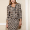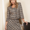 FALDA: EN TEJIDO DE BUCLÉ A CUADROS, DELANTERO DE UNA PIEZA AL SESGO CON CORTE SUPERIOR Y PRETINA COMPLETA. TRASERO: CORTES A LA ALTURA DE PINZAS, CIERRE INVISIBLE AL CENTRO TERMINANDO CON ABERTURA DE BESO. LA FALDA VÁ FORRADA.