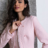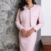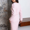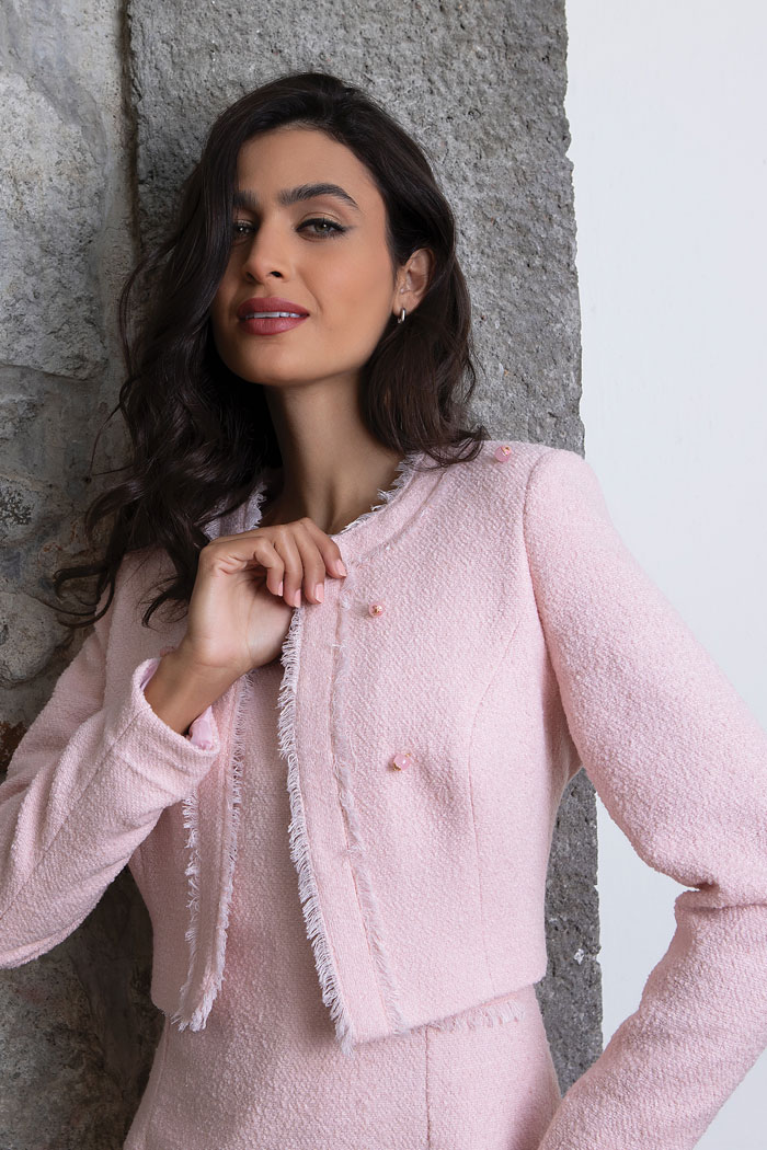 SACO TIPO BOLERO, ESCOTE REDONDO, CORTE PRINCESA Y COMO ADORNO LLEVA UNA TIRA DEHILADA EN LOS LADOS DE LA MISMA TELA EN EL CONTORNO ESCOTE Y FILOS Y BOTONES DE PERLA DE FANTASÍA DISTRIBUIDOS EN LOS DELANTEROS; CIERRA CON CUATRO BROCHES DE GANCHO INTERNOS. ESPALDA: ESCOTE REDONDO CON CORTE DE CENTRO Y PINZAS EN TALLE, LLEVA COSTADILLO Y MANGA LARGA DE DOS PIEZAS. TODA LA PRENDA VÁ FORRADA.