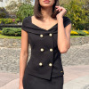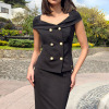 SACO ESCOTE TIPO BARCO CON HOMBRO ANGOSTO. CUELLO BARCO TALLE DELANTERO CON CRUCE Y CORTES TIPO FRANCES COSTADILLO RECTO ESPALDA CON CORTES TIPO FRANCES. SACO SIN FORRO