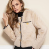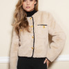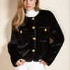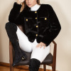 SACO ESCOTE REDONDO CON CINTA EN COLOR NEGRO ,CRUCE NORMAL CON 4 BOTONES AL FRENTE ,2 CARTERAS EN LA PARTE SUPERIOR DEL DELANTERO CON BIES EN COMBINACIÓN COLOR NEGRO Y UN BOTÓN DE ADORNO. MANGA LARGA.