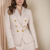 SACO CON CUELLO Y SOLAPA DE LANZA. SACO CON CRUCE, BOTON DORADO GRANDE 6 PZAS (OJAL DE VIVO). DELANTERO CON DIAGONAL DE CINTURA HACIA DOBLADILLO. DELANTERO CON CORTE TIPO PRINCESA, BOLSA DE VIVO CON CARTERA. COSTADILLO RECTO. ESPALDA RECTA CON COSTURA EN CENTRO. MANGA LARGA DE DOS PIEZAS. SACO CON FORRO