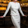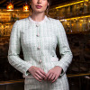 SACO CON ESCOTE REDONDO CON TIRA DE PERLAS EN CONTORNO. TALLE DELANTERO CON CORTE TIPO PRINCESA, ABROCHA CON 5 BROCHES Y 5 BOTONES (BOTON DE ADORNO). TIRA SIMULANDO VIVOS EN CINTURA Y TIRA EN RUEDO EN DELANTERO. COSTADILLO RECTO, ESPALDA CON CORTE TIPO PRINCESA Y MANGA LARGA DE DOS PIEZAS. FORRO DE TAFETA EN EL INTERIOR PLACA EN CINTURA LADO IZQUIERDO