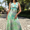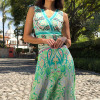 VESTIDO: ESCOTE EN V. TALLE CON CRUCE CORTE IMPERIO, TIENE DOS PLIEGUES EN EL BUSTO. CINTURILLA ANCHA CON PINZAS LATERALES. FALDA LARGA CON AMPLITUD. ESPALDA CON CIERRE EN CENTRO ESPALDA, TALLE CORTE IMPERIO. CINTURILLA ANCHA, Y FALDA LARGA CON AMPLITUD. FORRO DE ALGODON. PLACA EN CINTURA LADO IZQUIERDO
