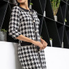 VESTIDO CORTE RECTO CON PINZAS AL FRENTE CON CUELLO REDONDO EN COMBINACION NEGRO Y FILO DE PERLAS, CON ALETILLA EN COMBINACION NEGRO CON FILO DE PERLAY BOTON DE ADORNO AL FRENTE CON CARTERA Y CIERRE INVISIBLE EN ESPALDA