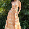 VESTIDO: CUELLO Y PIE DE CUELLO CAMISEROS. BOTONES EN PIE DE CUELLO CON PRECILLAS DE TELA TALLE TIPO HALTER DELANTERO CON PINZA LATERAL Y DE BUSTO, ALETILLA EN DELANTERO QUE LLEGA HASTA LA CINTURA, BOTONES DORADOS EN TALLE DELANTERO, FALDA AMPLIA LARGA. TALLE ESPALDA TIPO HALTER, CIERRE EN CENTRO DELANTERO QUE LLEGA A MITAD DE ESPALDA, BOTON FORRRADO Y PRECILLA EN PIE DE CUELLO. FALDA AMPLIA Y LARGA. CINTURON DE LA MISMA TELA. FORRO EN FALDA DE ALGODON. PLACA EN CINTURA LADO IZQUIERDO