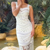 VESTIDO: EN TEJIDO DE GUIPIURE, ESCOTE TIPO STRAPLESS CON TIRANTES EN TELA LISA, PINZAS DE COSTADO Y EN TALLE. ESPALDA MISMA IDEA DE DELANTERO, PINZAS EN TALLE Y CIERRE AL CENTRO TERMINANDO CON ABERTURA DE BESO. VÁ SISADO. LA PRENDA VÁ FORRADA.