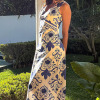 VESTIDO: LARGO RECTO CON ESCOTE EN V, CORTE IMPERIO, PINZA DE COSTDO A BUSTO Y EN EL TALLE, PLACA DE LADO IZQUIERDO A LA ALTURA DEL CORTE. ESPALDA CON CIERRE INVISIBLE Y ABERTURA.