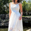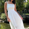 VESTIDO: TIRANTE DE TIRA BORDADA. TALLE CON CORTE TIPO FRANCES, ESCOTE RECTO, CINTURILLA ANGOSTA Y FALDA AMPLIA LARGA. TALLE ESPALDA CON PINZA LATERAL, CIERRE INVISIBLE EN CENTRO ESPALDA, CINTURILLA ANGOSTA Y FALDA AMPLIA LARGA. FORRO DE ALGODON (FORRO A LA RODILLA). PLACA EN CINTURILLA LADO IZQUIERDO